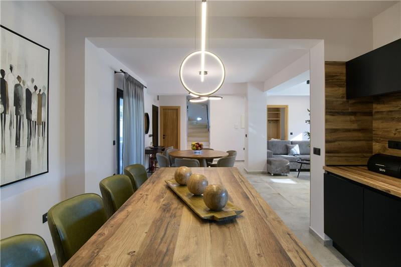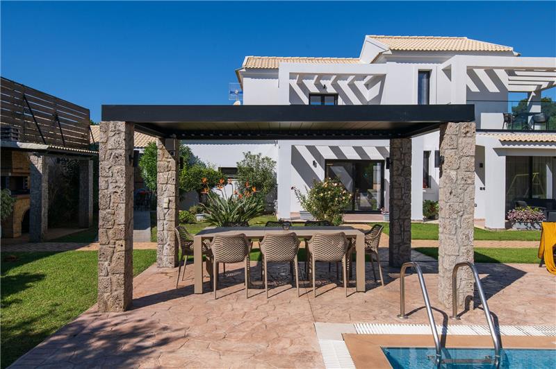 The approach leads to a convenient parking area within the grounds. Entrance – On the ground floor, guests will find a light-filled sitting room with adjoining dining area, alongside a kitchen. This level also features a guest cloakroom with washing machine, a double bedroom with an en-suite bathroom including a whirlpool bath, and a further double bedroom with en-suite shower room designed to be accessible for guests with reduced mobility. On the first floor there is a twin bedroom with en-suite shower room and access to a furnished terrace, as well as an additional double bedroom with en-suite shower room and its own terrace with table and chairs. Outside, the grounds provide inviting spaces for relaxation and socialising, including a shaded gazebo with outdoor dining area and a swimming pool surrounded by sun loungers for leisurely days in the Corfu sunshine.
