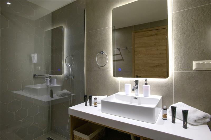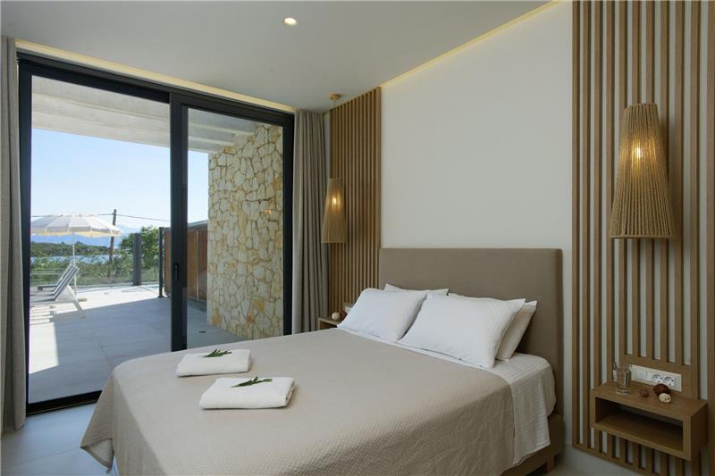 The approach is via a quiet road leading to on-site parking beside the house. The main entrance door opens on the ground floor into a generous open-plan living area comprising a comfortable lounge, a dining space and a kitchen. A separate WC is also located on this level. There are three bedrooms in total, each with its own en suite shower room. Two bedrooms are furnished with double beds, while the third offers twin beds that can be arranged as a double upon request. Outside, guests will find an inviting swimming pool surrounded by a sun terrace, along with ample space for al fresco dining and barbecues, creating an ideal setting for long summer days beneath the Greek sun.