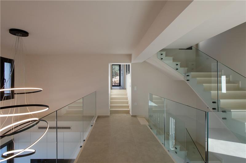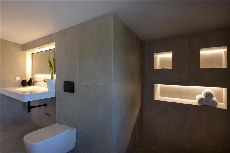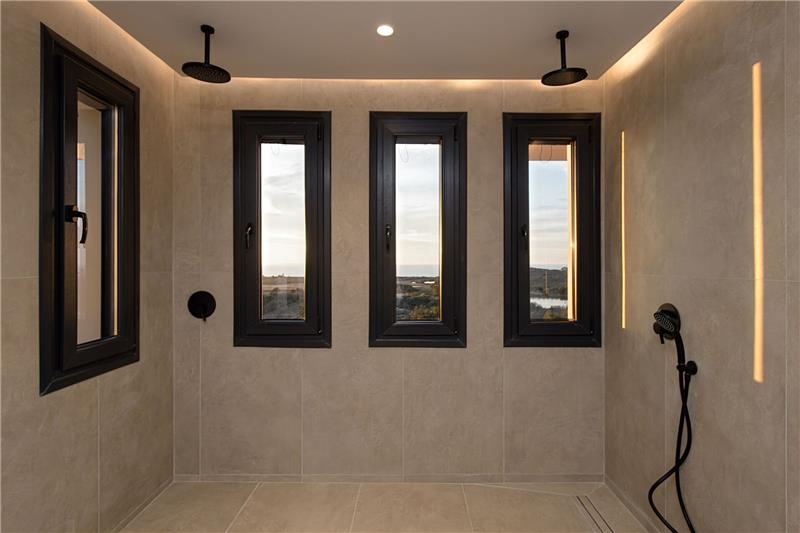 The approach and car parking location are conveniently arranged at the front of the property. On the ground floor, guests step into a bright open-plan living area incorporating a comfortable lounge, dining space and kitchen. A guest cloakroom is also found on this level. A few steps lead up to a double bedroom with an en-suite shower room and balcony. On the first floor there is a generously sized double bedroom with an en-suite twin shower room, along with access to a sea-facing terrace. A further double bedroom on this floor benefits from its own en-suite shower room. The second floor hosts an additional double bedroom with an en-suite shower room and direct access to a terrace with far-reaching views. Outside, guests can relax beside the swimming pool, complete with a whirlpool corner, sun loungers and an al fresco dining area, all set against a backdrop of open countryside and sea vistas.