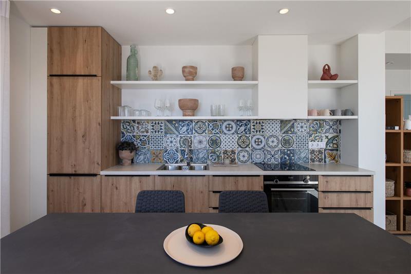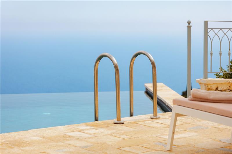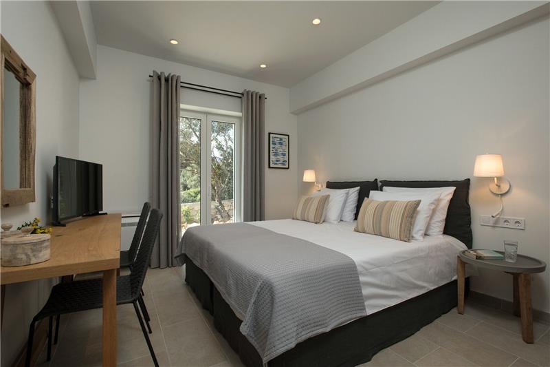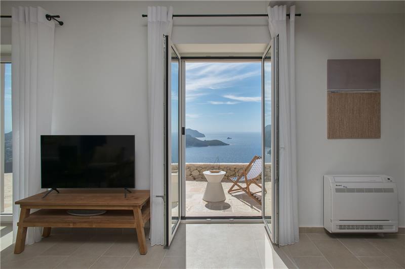 The approach and car parking location are positioned slightly below the house on the hillside, with a lift providing convenient access up to the main entrance. On the ground floor, guests step into an open-plan living space comprising a comfortable sitting area, a dining space and a kitchen corner. This level also hosts a double bedroom and a shower room. On the first floor there is a further double bedroom with its own shower room, as well as a twin bedroom, also benefiting from an en-suite shower room. Generous windows throughout the house frame the coastal views and allow natural light to flood the interiors. Outside, a spacious terrace looks out towards the sea and features a swimming pool and sunbathing area, inviting guests to unwind while enjoying the fresh Ionian breeze.