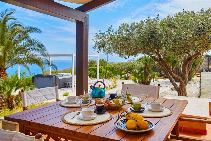 The approach is via a short access lane, leading to gated on-site parking. Entrance is through a covered porch and directly into an airy, open-plan living space on the ground floor, bringing together a seating area, dining space and fitted kitchen, all cooled by air conditioning. There are two bedrooms, both fitted with mosquito screens and fans: one double room and a twin room with views towards the sea, served by a shower room. Outside, the covered porch is arranged for outdoor dining and overlooks a sun terrace with a jacuzzi, loungers and seating, creating a welcoming area for guests to relax and enjoy the coastal outlook.