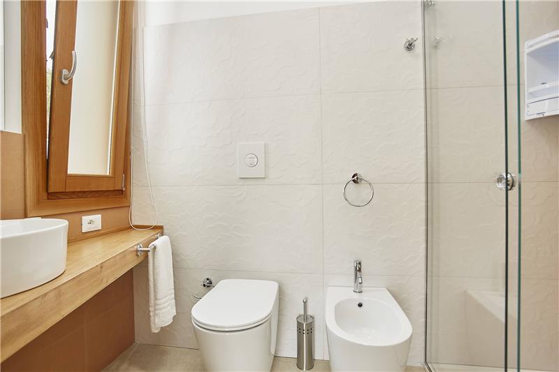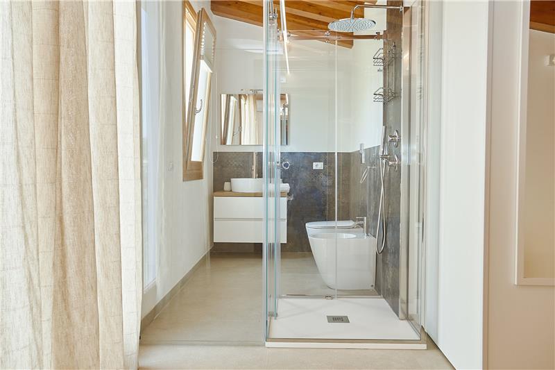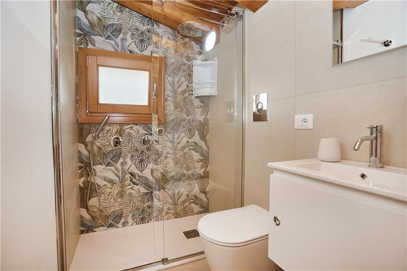 The approach leads to on-site parking close to the house. Entrance is on the ground floor, opening into a bright open-plan living area that combines a kitchen, dining space and comfortable seating, including a sofa bed. From here, large doors lead directly out to a covered veranda furnished for al-fresco dining and relaxation. Also on this level are two double bedrooms, one with an en-suite shower room, along with a further shower room. On the first floor guests will find two additional double bedrooms, both with en-suite shower rooms; one of these enjoys access to a balcony and features an open-plan shower room arrangement. Outside, the grounds include a swimming pool, a sun terrace with loungers and an outdoor shower. A dedicated barbecue area with sink, work surface and gas grill provides an inviting setting for shared meals in the open air.