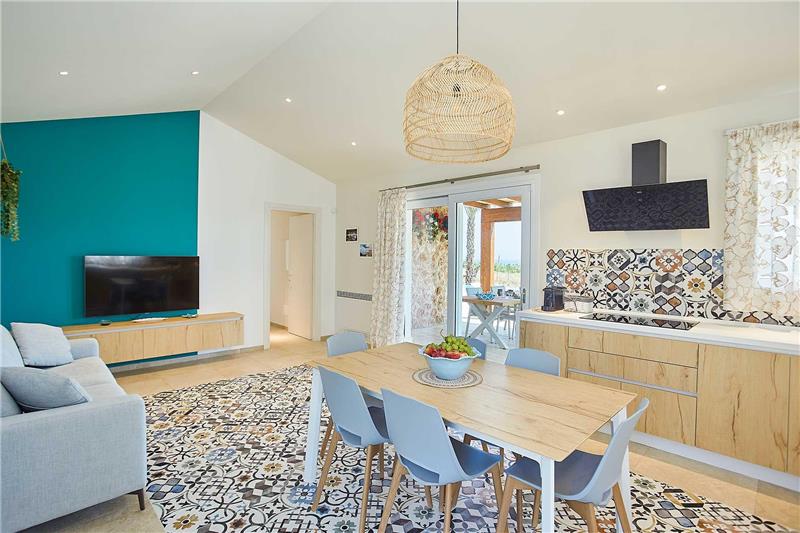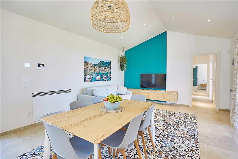 The approach and car parking location is via a driveway leading to on-site parking for two cars. The main entrance is on the ground floor, opening into a generous open-plan kitchen, sitting and dining area designed for sociable living. A hallway leads to two double bedrooms, one with an en-suite shower room, along with a single bedroom and an additional shower room. Patio doors from the kitchen open onto a covered terrace furnished with comfortable seating and an outdoor dining area overlooking the infinity pool, jacuzzi, outdoor shower and lawned garden. To the rear of the property, guests will find an outdoor kitchen with work surface, sink and gas barbecue, alongside a practical laundry area equipped with a washing machine and tumble dryer.