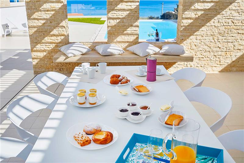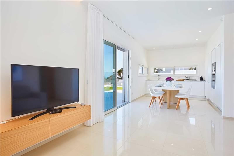 The approach leads through an automatic gate to on-site car parking within the enclosed grounds. Entrance is on the ground floor, opening directly into a bright open-plan living space with a comfortable seating area, alongside a kitchen. Large windows frame views towards the terrace, swimming pool and the sea beyond, allowing indoor and outdoor living to flow naturally together. The sleeping accommodation comprises three bedrooms in total, including two doubles and one twin that has the option of an additional bed on request. Guests have use of two shower rooms, and all bedrooms benefit from air conditioning and mosquito screens. A laundry room with washing machine and dryer adds convenience. Outside, the front terrace leads to the swimming pool with surrounding sunbathing area, sun loungers and an outdoor shower. To the rear of the house there is a covered terrace with an outdoor kitchen and barbecue, set within a neatly maintained lawned garden.