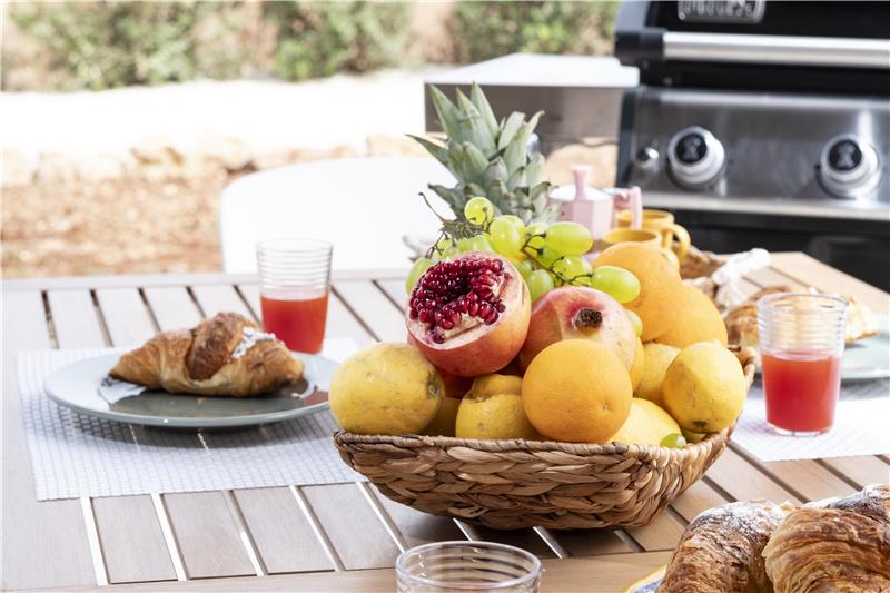The approach leads to on-site parking, from where guests enter directly into the ground floor. The entrance opens into a spacious open-plan kitchen and living area, fully equipped for everyday holiday living and arranged with a dining space and a welcoming lounge. Large doors lead out to a covered veranda furnished for outdoor meals and relaxed seating. The accommodation continues along a corridor to three double bedrooms, served by two shower rooms. All rooms benefit from air conditioning and mosquito nets. Outside, guests can enjoy the landscaped grounds, which include a swimming pool, a sun terrace with loungers and gazebo, an outdoor shower and a gas barbecue for informal al fresco dining.