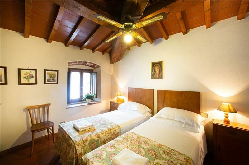 On the first floor, guests will find a double bedroom, a twin bedroom, and a compact bathroom with a sloped ceiling and shower.