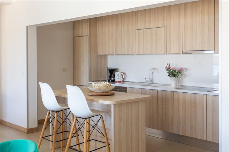 Spacious open plan lounge with kitchen, doors to a sea facing balcony with 2 sunbeds. There is also a WC and pantry on this level.