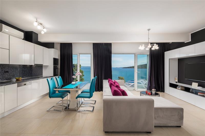Spacious open plan lounge with kitchen and dining table for 4 persons, doors to a sea facing balcony with 2 sunbeds. There is also a separate WC and a shower room.