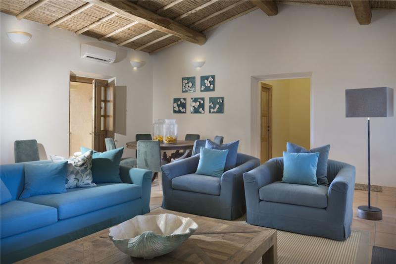 B. 165m2 - 3 bedrooms, sleeps 6. Guests are welcomed into a stylish open-plan living and dining area connected to a kitchen, with direct access to the garden. The pool area offers an ideal spot to relax and enjoy spectacular coastal sunsets. Inside, the main suite includes a chestnut and reed ceiling, a bathroom with Jacuzzi and shower, and a separate WC. Two further double bedrooms, each with independent access from the garden, have their own bathrooms with Jacuzzi baths. Terracotta and Orosei marble flooring throughout adds a warm, natural finish. A furnished terrace provides additional outdoor space for dining.