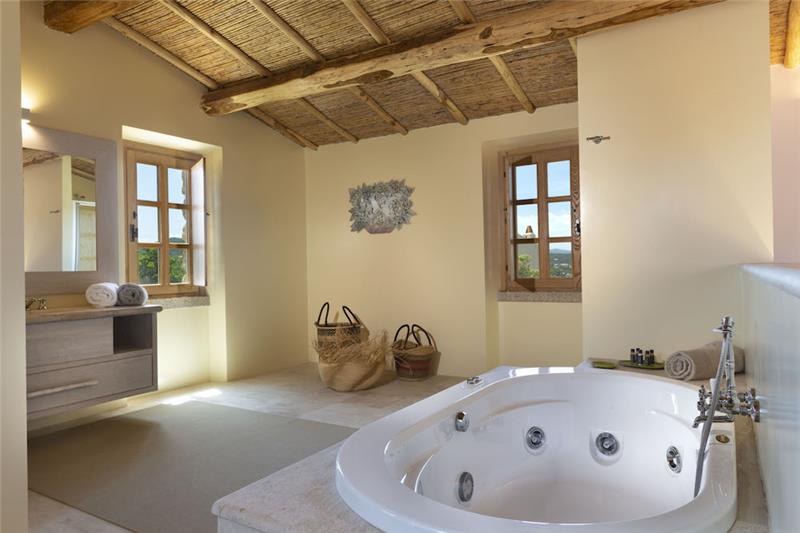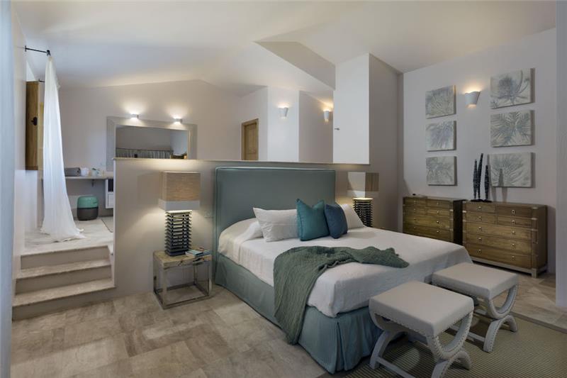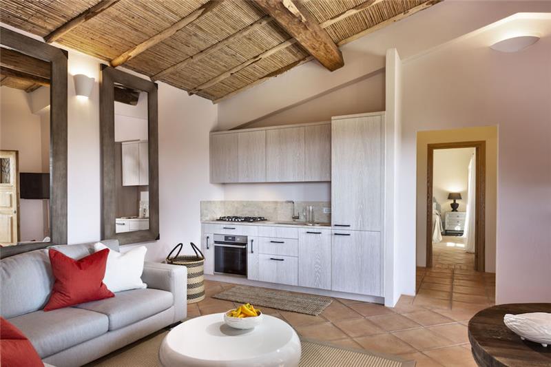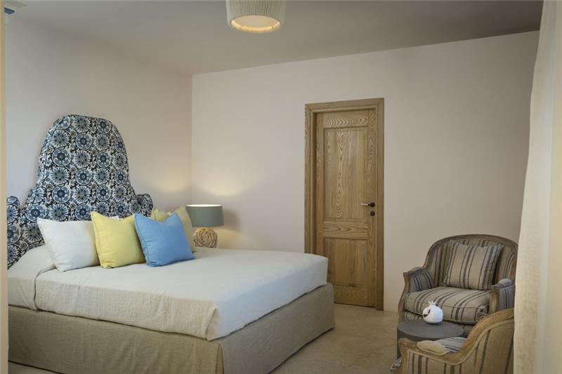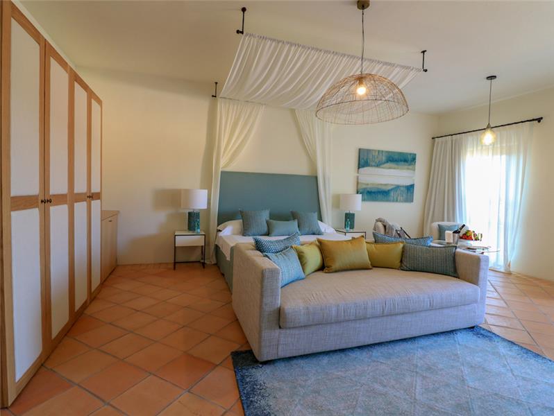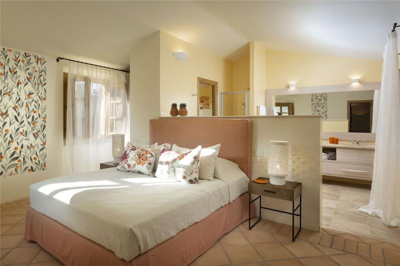 A. 130m2 - 3 bedrooms, sleeps 6. Split into two buildings, the bigger of the two includes two spacious double bedrooms, each with its own entrance and an en suite shower room. These open into a shared living area and a kitchen, The second, smaller building is accessed independently and offers a generously sized double bedroom, enhanced by oak flooring and elegant Orosei marble details. Behind the king-size bed, a hydromassage bath provides a tranquil corner for unwinding. An additional shower room completes this suite. Outside there's a terrace and heated pool.