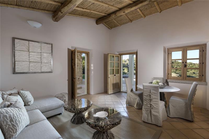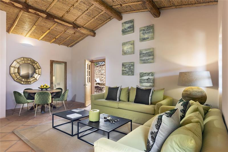 Guests arrive via a quiet country lane and can park directly adjacent to the villas. There are 7 unique villas, each with its own layout all centred around a hotel with a restaurant and pool. They all have traditional wooden beams and soft tones of green and grey that create an inviting and relaxed setting. Textiles in natural fibres and carefully chosen furnishings echo the calm and character of the Mediterranean surroundings. Outdoors, each villa enjoys the expansive landscaped garden, with a generously sized heated pool as the centrepiece. From here, sweeping views stretch across the coastline of the Costa Smeralda.
