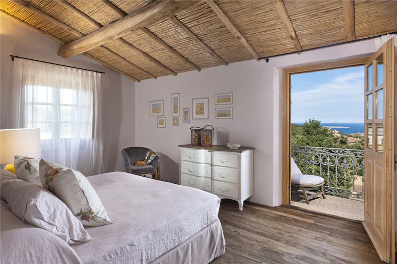 E. 200m2, 3 bedrooms, sleeps 6. Located in the heart of the village, this property offers a layout across two levels. On the ground floor, guests will find two double suites, each with independent access, and a third suite that connects internally to the main living space. All bedrooms include an en-suite with jacuzzi bath and shower. The central living area includes a kitchen and opens onto a covered veranda with a dining area overlooking the garden. A heated pool, set among teak decking and local stone, sits on the western side of the garden where guests can enjoy the sunset. A staircase in terracotta and juniper leads to the upper level, where there is an additional suite featuring a sleeping area with sea view, and access to a small terrace. The property also includes a roof terrace offering expansive views of the coastline and surrounding landscape.